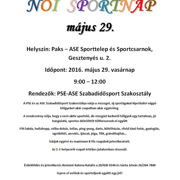 Elolvasom »Paks város 2016/17. évi Nyílt női röplabda bajnoksága Célja: röplabdázási lehetőség biztosítása, bajnoki helyezések eldöntése Helye: Paks, Deák Ferenc Ált. Isk. tornaterme pályáján. Ideje: ...